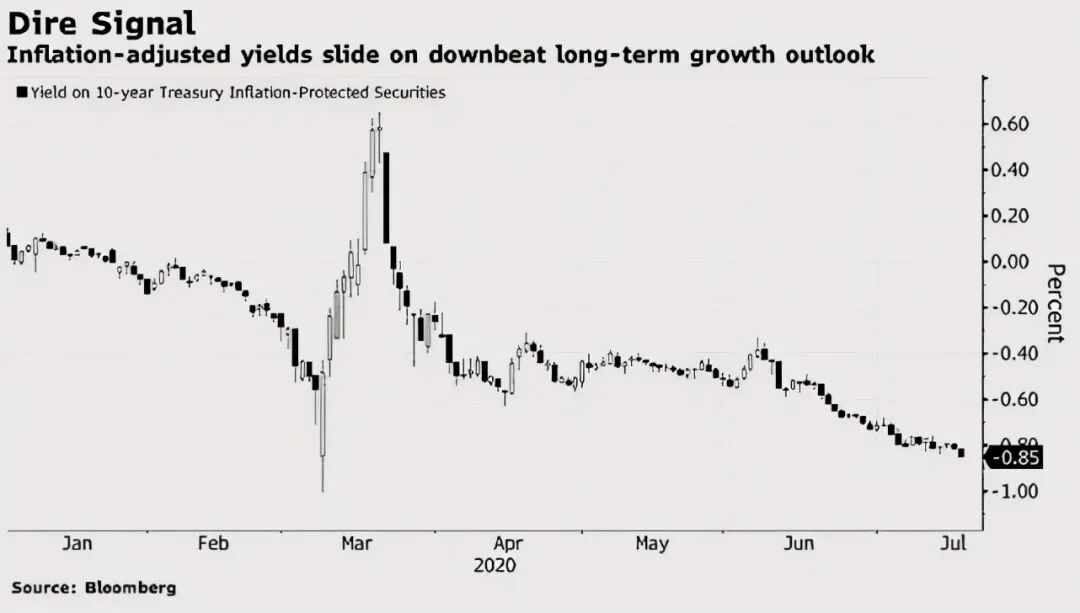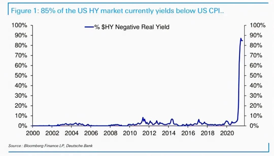 而据德银高级分析师吉姆·里德的报告,目前,美债市场中包括高收益率的垃圾债券在内的各期限美债产品中有85%的债券实际收益率为负值,低于当前的通胀率(具体数据趋势请参考下图)。