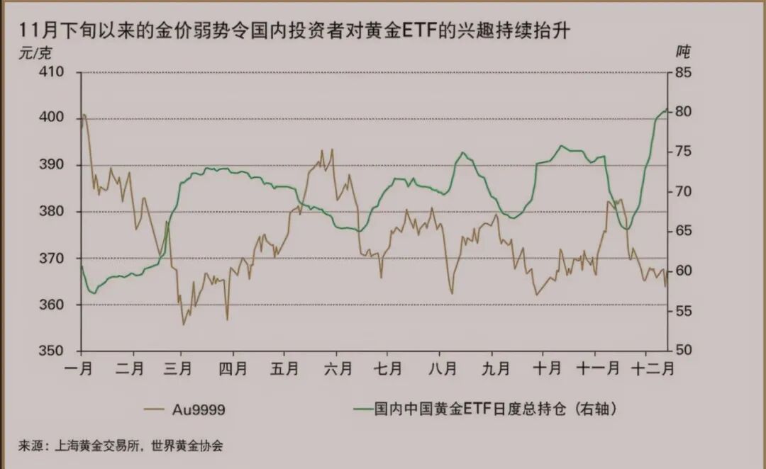 世界黄金协会在12月17日公布的数据显示,今年1月1日至12月16日,中国的黄金ETF总规模不断上升,总持仓已经超过80吨,相较11月底时大幅增长了12吨,相当于今年前11个月增长量的2倍,为历史最高,数据显示,今年前11个月,金交所的黄金累计出库1552吨,较2019年同期增长5%。