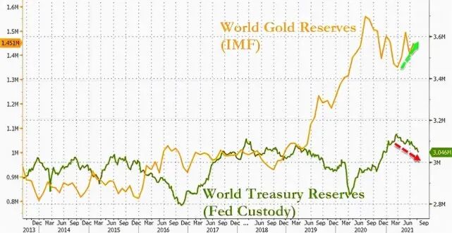 由IMF和世界黄金协会提供给我们的数据显示,最近几个月从美国债券到黄金的置换趋势仍在继续。