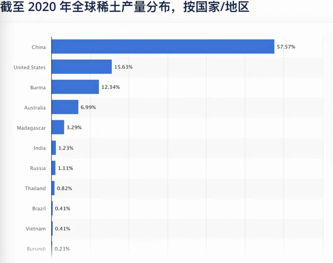 同时,中国在生产和精炼技术方面也领先于世界稀土行业。根据美国地质调查局的数据,到2021年,中国的稀土占全球总产量的58%。稀土是一种由17种化学元素组成的金属,这些元素被手机、新能源汽车、非民用设备甚至洗碗机等产品广泛使用,所以稀土有现代工业的维生素的称号,更是被视为解决气候变化等关键战略因素的关键。
