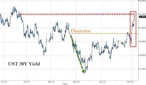 不仅于此,美财政部在2021年度最后一次的国债拍卖也表现得很糟,发行的600亿的7年期国债中标收益率也高于发行前收益率,国债招标需求也非常疲软,弱于预期,并且是1月以来最低中标水平,出现滞销。