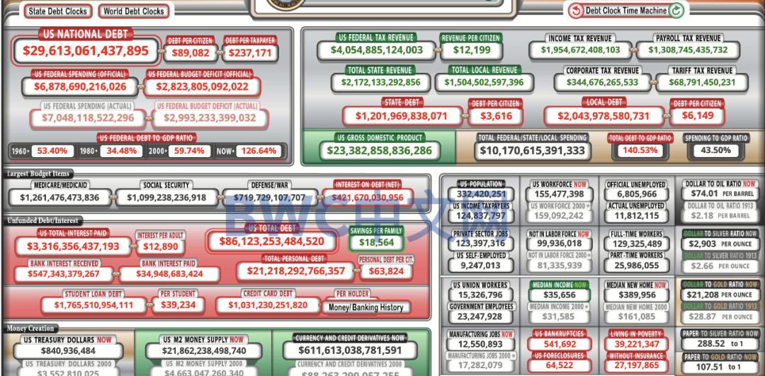 比如,BWC中文网财经团队查询美国金融市场分析机构TreasuryDirect在1月4日监测到数据显示,截止11月的2021财年内,美财政部虽然自2020年3月以来加快发债数量,但为债券支付的利息成本为7725亿,却要比2020年同期还减少了359亿,而成本之所以能下降的原因,是因为美国国债的实际名义收益率大幅下降的原因,从2019年5月的2.47%降至目前的1.59%,很显然,这些数据已经表明将为美国不断膨胀的债务提供了继续快速扩张的动力,截止1月7日,美国债务已经接近30万亿美元大关,相较2021年初大幅增长了9万亿美元。