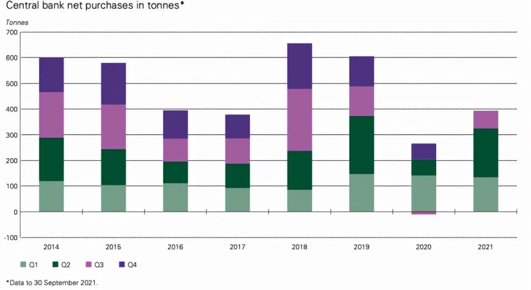 据世界黄金协会1月报告,2021年全年,高不确定性、宽松货币政策、高通胀、极低利率,避险资产的价格动力、美元贬值以及对出现通胀的担忧共同推动了创纪录的资金流入黄金支持的ETF达3780吨,虽然全球央行自2020年10月以来购金行动有所放缓,但2021年仍净购了超过400吨的黄金,而他们已经在2020年、2019年和2018年这三年中净购买了1700多吨黄金(具体数据请参考下图),达到美元与黄金挂钩那年的购买速度。