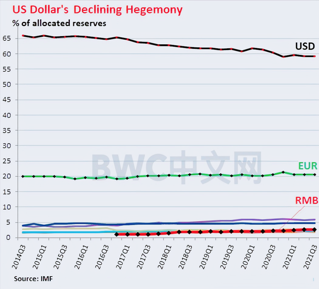 这也意味着,现在无底线的货币宽松和实际负利率将促使美元流动性由涝转旱,并促发全球市场寻找美元的替代方案,据IMF上个月公布的数据,美元份额在2021年第三季下降至25年来最低,占比意外降至59.2%,而2000年时该比例还高达73%。