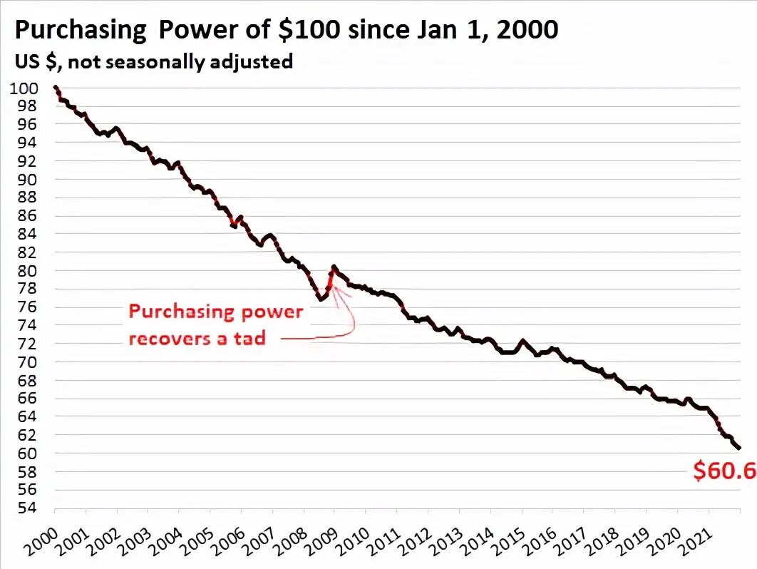 正如BWC中文网财经研究团队所分析的那样,在1913年,1美元可以购买30颗Hershey的巧克力棒,但到现在1美元才仅够购买8卷厕纸。按美国西弗吉尼亚州议员,金本位制的捍卫者亚历克斯.穆尼的解释就是,自1913年以来美元已经丧失了96%的价值,平均每过一代人美元就会损失掉50%的购买力,这在美国通胀持续恶化的背景下将变得更加明确。