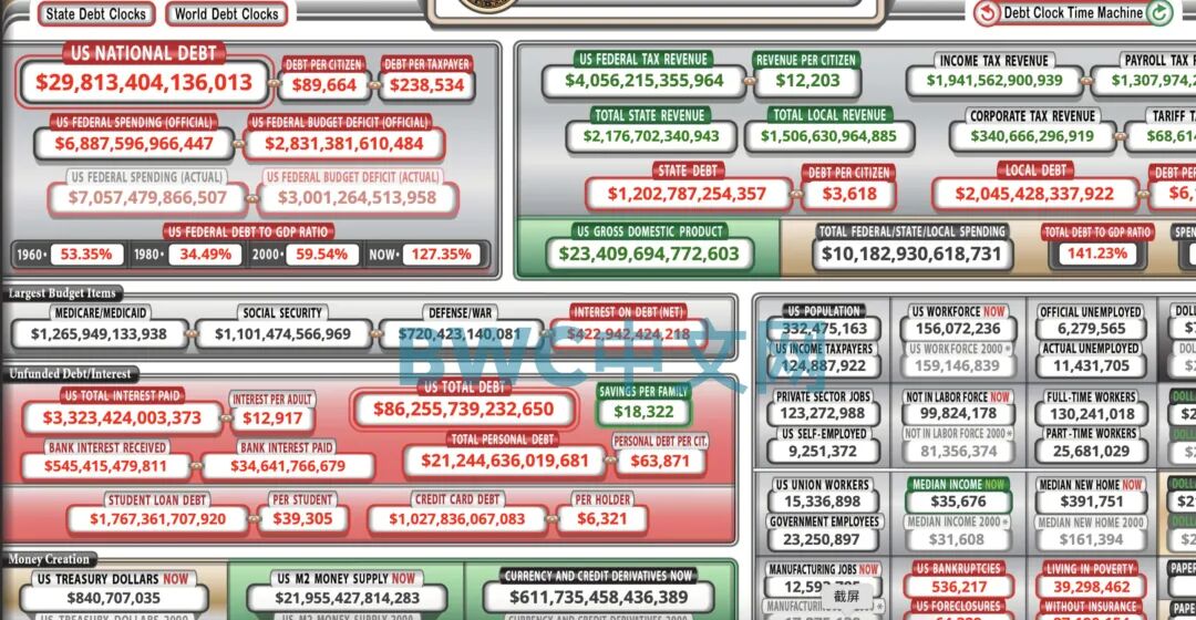 目前,在下面这个像飞机仪表盘样的美国联邦国债实时钟上显示的债务赤字总额已连跳三级触及30万亿美元大关,且债数据还在实时增长中,相较1989年里根发表离职讲话时更是增长了7倍还多,德意志银行表示,按照目前的速度印钞,到2022年3月,美联储资产负债表将扩张至9万亿。