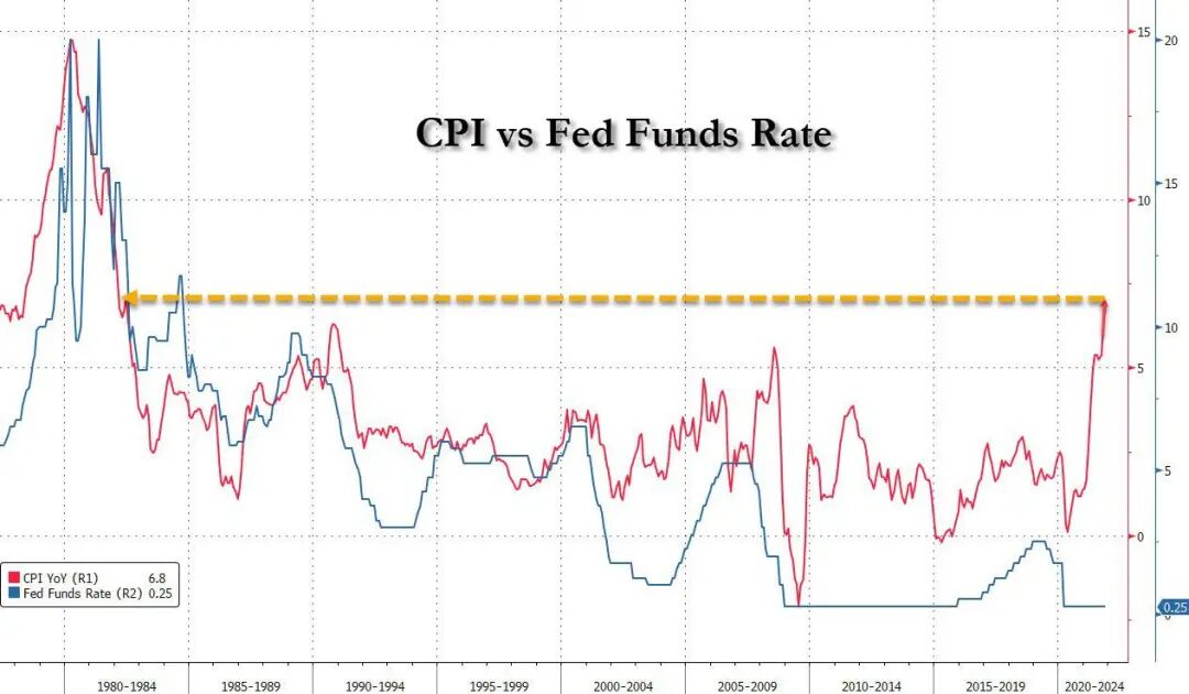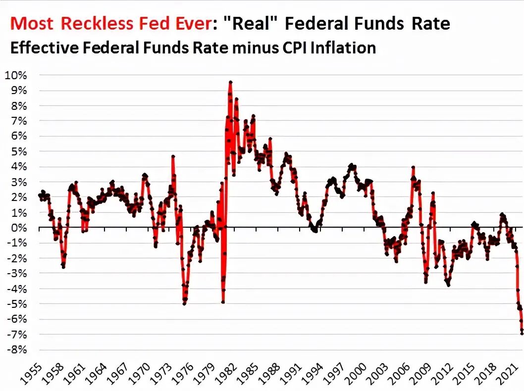 这种前景提升了美债连续两年负回报的前景,且将是1974年开始有记录以来的首次。数据显示,美债指数2021年的总回报率为负2.3%,是以名义价格计算2013年以来首次下跌,而这也意味着美债已经出现技术性熊市的指标。这也意味着美国实际的有效联邦基金利率(EFFR)经通胀调整后变为负6.96%,目前是1954年以来最负值区间(具体数据趋势请参考下图)。