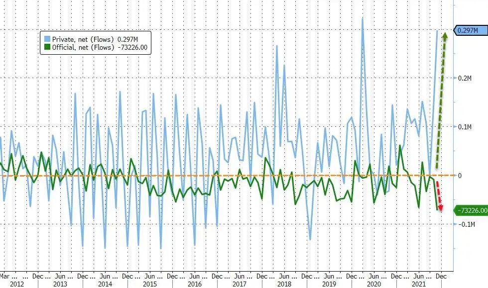 另外,据美国财政部在1月19日最新发布的国际资本流动报告也显示,2021年11月,虽然私人投资者买入了600多亿美债,但包括全球央行在内的大机构却卖出419亿美债及205亿的美国股票,其中,全球央行连续第七个月净抛售美债(具体数据趋势请参考下图)。不过因美债官方数据会有两个月的延迟惯例,近几周以来,随着十年期美债收益率震荡加剧,料将会看到更多的抛售。