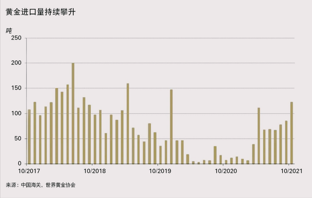 而更让市场意外的是,据中国黄金协会在1月27日发布的数据显示,2021年进口原料产金114.58吨,据海关发布的最新数据,截至去年12月的前11个月内,中国的黄金总进口量高达696吨,大幅高于2020年,比如,去年10月中国的黄金进口量就达到2019年12月以来的最高值,大幅增长了123吨。