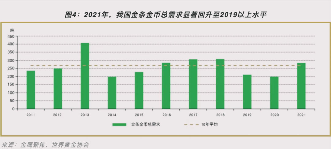 不仅于此,中国市场中的黄金进口量和销售量也整体展现出强劲态势。世界黄金协会的数据显示,2021年中国的金条和金币销量全年达675吨,同比增长63%。