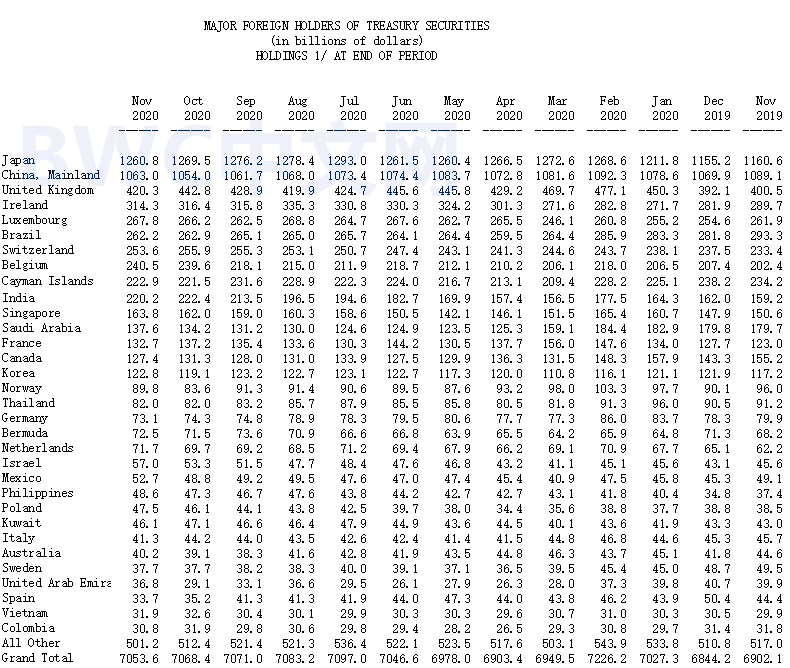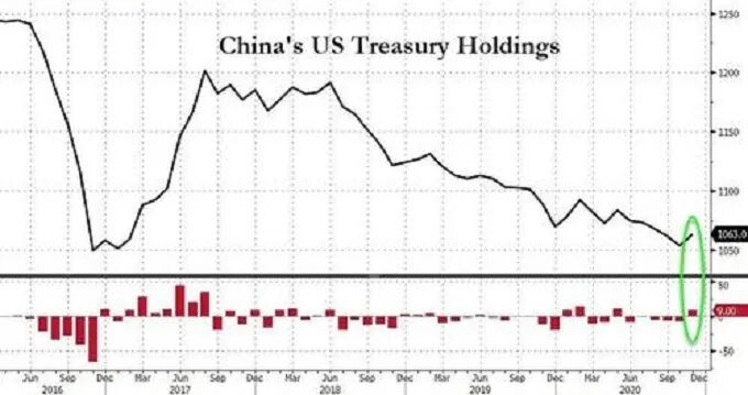 报告数据显示,11月,中国净购买了90亿美元的美国国债,使得持美债仓位增至1.06万亿美元,我们注意到,这是中国在去年10月份之后的首次增持,在2020年6月至10月,中国曾在5个月内连续累计减持297亿美债,持仓量降到四年(2017年1月)以来最低水平。而在此之前的24个月内,中国持续累计抛售了约1663亿美债。