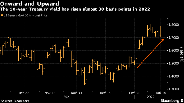 这也使得美国国债价格在2月5日出现大幅下跌(债券收益率与价格成反比,收益率上升代表债券被市场抛售,而不是买进),短期国债收益率大幅上扬,10年期国债收益率突破1.92%,触及2020年初以来高位。2年期国债收益率上涨12个基点,触及1.315%的日内高位,因为短端开始重新定价美联储的加息路径。