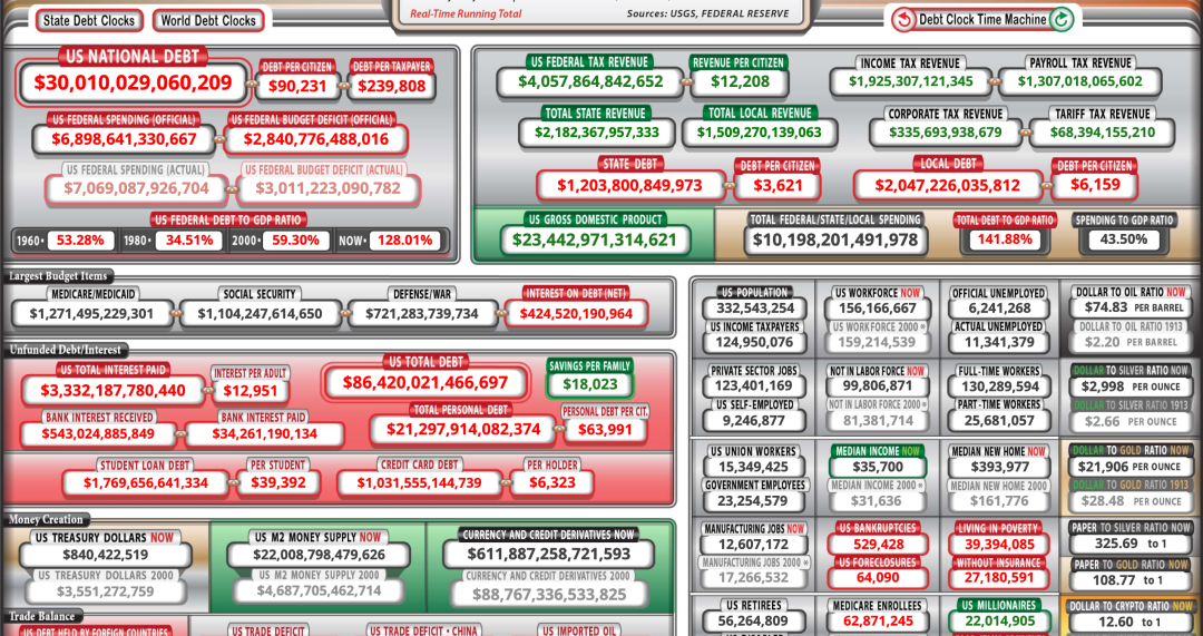 2月5日,在下面这个像飞机仪表盘样的美国联邦国债实时钟上显示的债务总额已经超过30万亿美元大关,且债务数据还在实时增长中,相较31年前增长了7倍还多,但这只是美国债务冰山一角。美国纳税人的责任远不止于此。