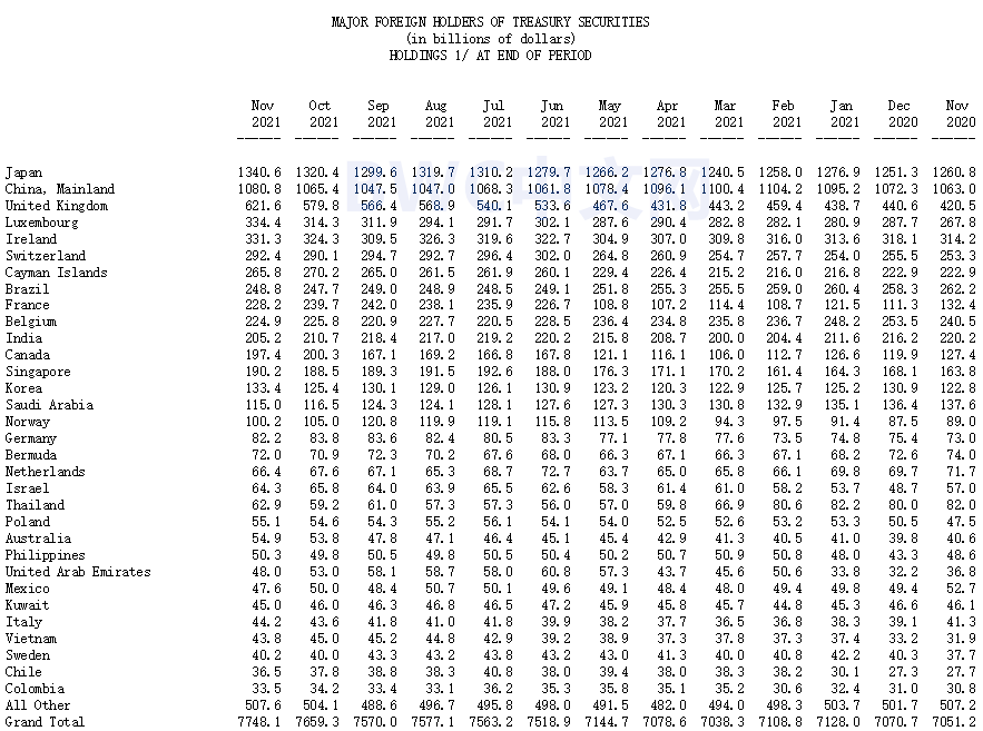 比如,据美国财政部在1月18日公布的国际资本流动报告显示,外国买家已经在截止去年11月的六个月中持续净卖出3219亿美债(具体数据细节请参考下图),甚至,据彭博社在2月5日援引的数据显示,一支注册在日本的全球最大的养老基金也宣布在去年出售其34%美债的基础上,计划在近几周再减少美债仓位,而目前俄罗斯已经在其国家财富基金中完全剔除了美元,另外,该国也抛售了较其高点持仓时占比达97.29%的美债至20亿美元,且正在将其美债持仓作清零准备。