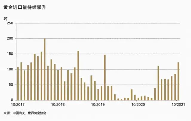 不仅于此,中国市场中的黄金进口量和销售量也非常火爆,据世界黄金协会和海关数据,截至1月31日,中国的黄金ETF总规模不断上升,总持仓已经超过82.4吨,且为连续第六个月保持净流入,相较2021年11月底时大幅增长了12吨,按吨位计算为有史以来的最高水平,数据显示,2021年,上海黄金交易所的黄金累计出库1598吨,较2019年同期增长5.2%,其中,金饰需求达到167吨,同比增长33%,金条、金币的销量总量达69吨,同比上升12.1%。