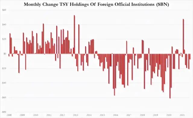 此消彼长,全球央行与黄金储备的增长形成鲜明反差,紧接着,美国石英网站一周前援引华尔街经济学家的最新观点认为,包括中国、日本、俄罗斯、德国等在内全球央行很有可能会抛售大量美债,随着美国通胀持续攀升后使得美债隐性违约风险增加后,也存在清零美债的可能。而就在这个节骨眼,又出现了一件意外的事情。