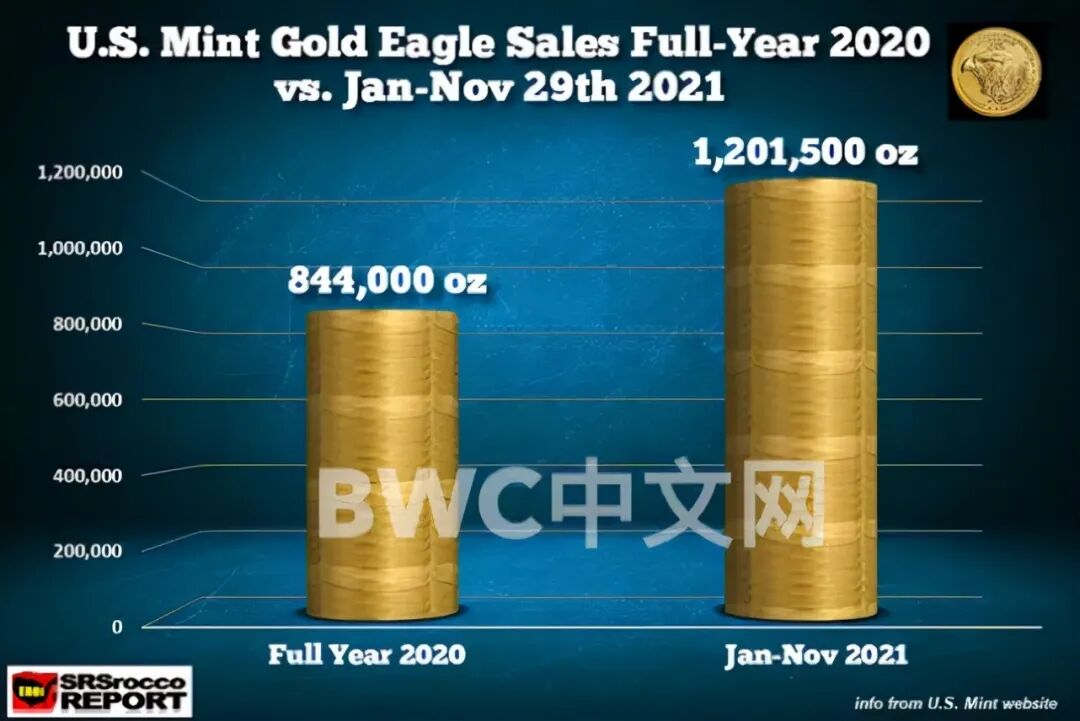 据美国铸币局在2月2日公布的数据,美国人开始抢购和囤积金币,截至2022年1月31日的前十个月,美国的金币总销量高达198.5万盎司,比二年前同期增长169%,甚至2021年仅用了10月至12月这三个月的销量(36.7万盎司)就一举超过了2018年全年的销量(高出18万盎司),而按世界黄金协会最新发布的需求报告计算,2022年美国金币的总需求量将约为450万盎司,另外,美国数据公司Palantir也在一周前发布的声明中表示,他们购买了5000万美元的金条以应对风险事件和高通胀,并邀请其客户也用黄金来购买其服务。
