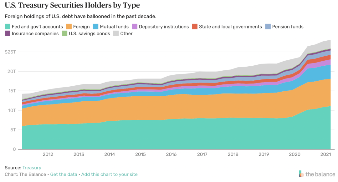 美国联邦政府还欠自己6.5万亿美元,主要是社会保障、信托和部分退休基金,自2020年3月以来,美联储还通过大举购买数万亿美元的国债和证券,将其资产负债表翻了一番,达到8.9 万亿美元。
