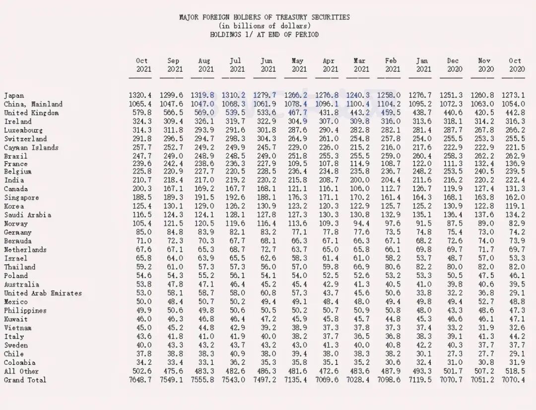 值得注意的是,美财政部的报告还显示,中国继2021年9月小幅增持6亿美债后,在10月份开始大幅度增持了178亿美债后,在11月再次大幅增持了154亿美债,结束了8月大幅减持213亿美元的状态,另外两次大幅减持美债为5月和6月,分别减持177亿和165亿美元(具体数据细节请参考下图)。