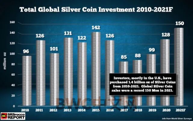 另外,美国数据公司Palantir也在一周前发布的声明中表示,他们购买了5000万美元的金条以应对风险事件和高通胀,并邀请其客户也用黄金来购买其服务,同时,2021年以美国市场为代表的银币销量也创下历史新高,银币销量为1.477 亿盎司。而就在这个节骨眼,又出现了一件意外的事情。