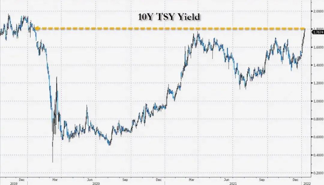 2月11日,美国指标10年期美债收益率触及2019年12月以来最高,2月10日,美国劳工部公布的1月CPI创下40年来最大同比涨幅至7.5%(前值为7.0%),且为连续第六个月加速上升,这加剧了人们对美联储在3月大幅加息50个基点的猜测(高达八成),这也使得10年期通膨保值债券(TIPS)收益率自2020年6月以来首次升至负0.5%上方。