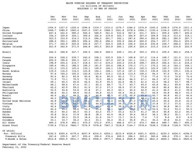 据美国财政部在2月16日最新公布的国际资本流动报告显示,美债官方数据会有两个月的延迟,2021年12月,在中国和日本两个全球最主要的美债持有者的集体减持之下,2021年12月,包括私人投资者在内的海外大机构净抛售了334亿美元美债,其中,全球官方资金净流出190亿美元,全球官方外资曾在去年11月增加了663亿美债,当时所持规模创历史新高,为去年3月日本养老金抛售以来的最大月度增幅。