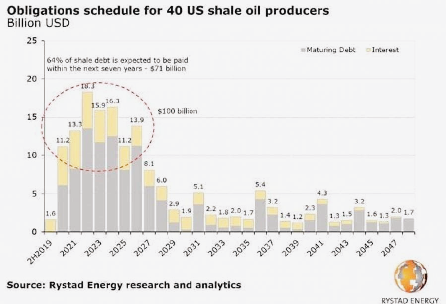 特别是近几周以来,美布两大国际基准油价差显著收窄至不足1美元,这会给美国的能源债务经济带来意外冲击,因为,美国页岩油相较中东原油一直保持的价格优势将失去竞争优势,虽然,油价上升,美国石油公司获得了现金流,但一旦油价上涨周期结束,且随着OPEC产油国加大供应抢占市场,这仍将会使得美油商借新债还旧账的困境再次开始显现,这可能会加剧页岩油巨头蒙受巨大损失,那么,美国页岩油气商就会出现债务和利润问题,正如下图数据所示,美国排名前40位的页岩油生产商预计将在债务分期付款和利息方面花费约1000亿美元。