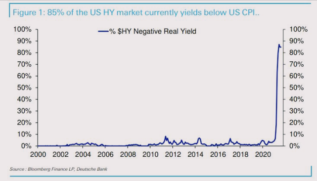 德意志银行研究员Jim Reid在3月4日发表的报告中指出,虽然俄乌局势突然升级使得美债价格上涨,但是目前,美国债券市场中仍有近80%的不同期限的美债收益率低于当前的通货膨胀率,实际收益率为负值,但事情到此并没有结束。
