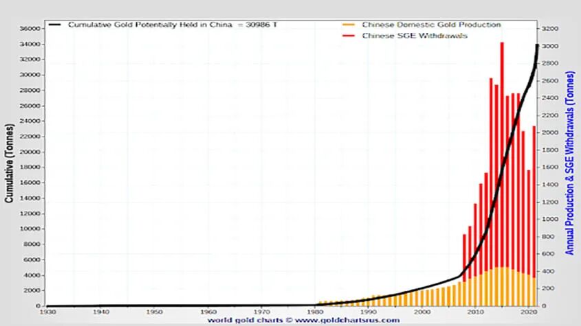 该美媒对SGE公布的数据作为中国实际储存黄金需求的观察窗口发现,正如下图数据所示,自2008年以来,已经从SGE中交易了2.2万吨黄金,加上自2000年以来的累计黄金产量,得到中国市场上储存有超过3.1万吨黄金的数字。