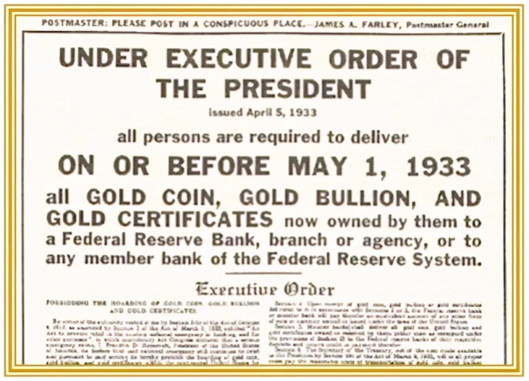 美国没收民众黄金的事件发生在1933年,当时出于种种原因,时任美总统罗斯福就通过了一份臭名昭著的行政命令,长话短说,美国人被要求上交他们的黄金,将美国民众手里的黄金充公,作为回报,他们将在银行存入一笔存款(具体内容请参考下图)。而按现在的市场消息来看,显然美国民众有了这种担忧。目前,美国人正在抛售美债而抢购和狂买囤积金币。