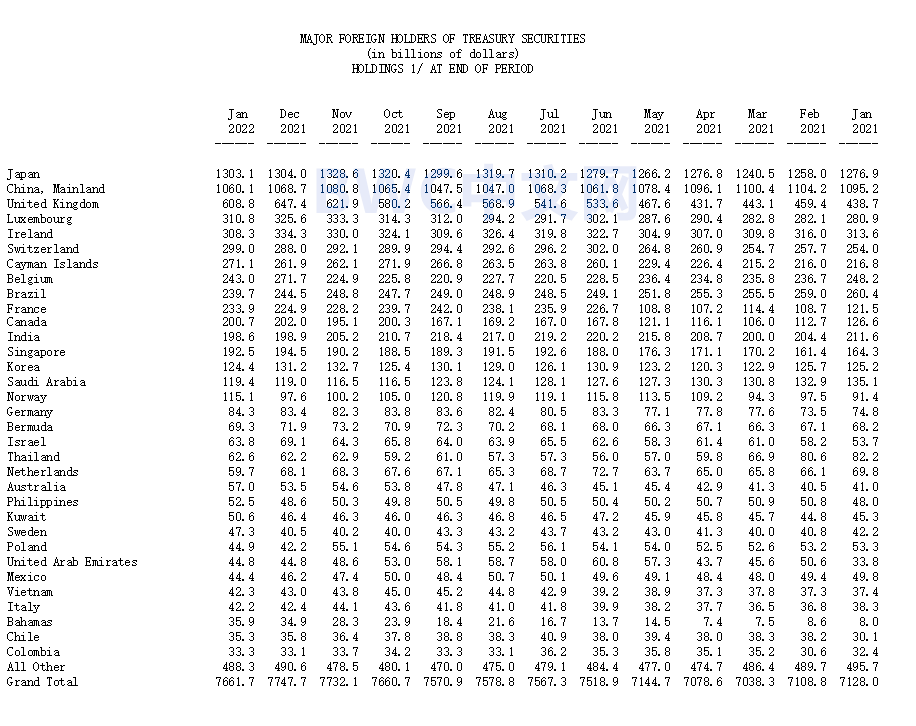 比如,据美国财政部3月16日最新公布的国际资本流动报告显示,美债官方数据会有两个月的延迟惯例,中国在1月份继续大幅减持86亿美元的美债,持仓降至1.0601万亿美元,去年12月,中国大幅度减持了122亿美元的美债至1.0687万亿美元,这也意味着中国连续两个月开始大幅减持208亿美元的美债,打破了此前连续三个月增持美债的状态,2021年11月和10月分别增持了154亿和178亿美元的美债(具体数据细节请参考下图)。
