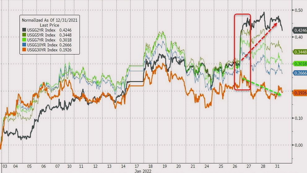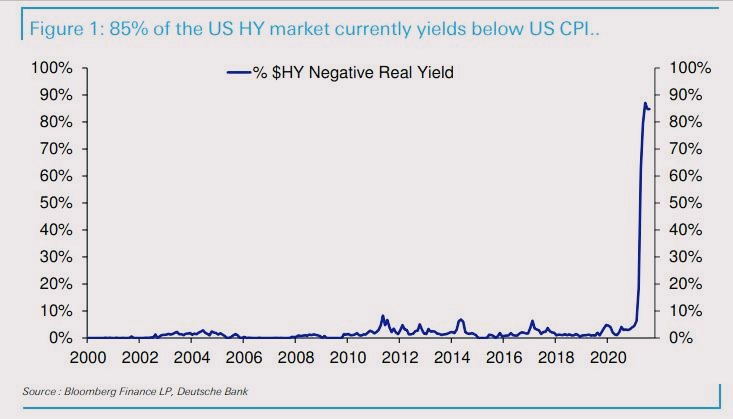 这种前景提升了美债连续两年负回报的前景,且将是1974年开始有记录以来的首次。数据显示,美债指数2021年的总回报率为负2.3%,是以名义价格计算2013年以来首次下跌,而这也意味着美债已经出现技术性熊市的指标。紧接着,德银高级分析师吉姆·里德发表的更新报告认为,目前,包括高收益率的垃圾债券在内的各期限美债产品中高达87%的债券实际收益率为负值,远低于当前的通胀率。