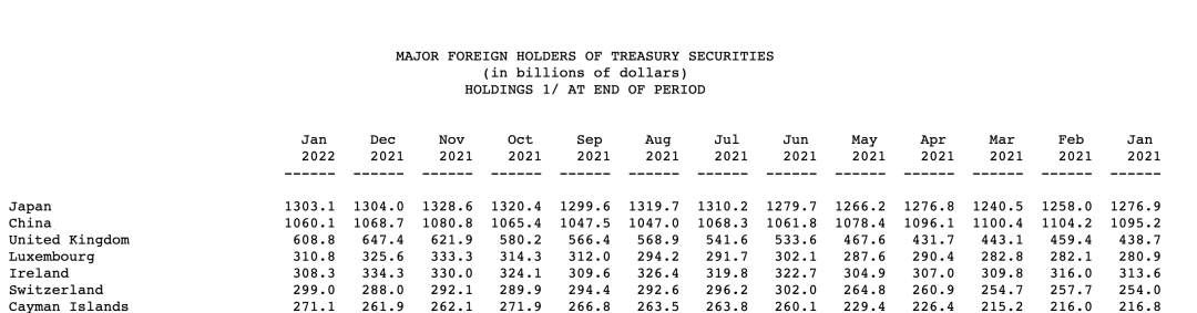 值得注意的是,美财政部的报告还显示,中国在1月份继续大幅减持86亿美元的美债,持仓降至1.0601万亿美元,去年12月,中国大幅度减持了122亿美元的美债至1.0687万亿美元,这也意味着中国连续两个月大幅减持了208亿美元的美债,打破了此前连续三个月增持美债的状态,2021年11月和10月分别增持了154亿和178亿美元的美债(具体数据细节请参考下图)。