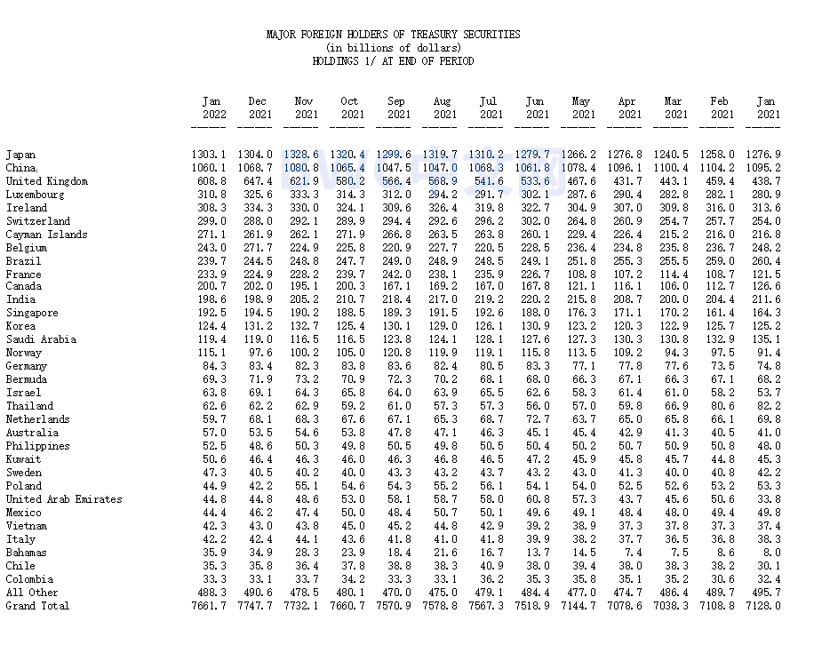 据美国财政部3月16日最新公布的国际资本流动报告显示,美债官方数据会有两个月的延迟惯例,1月,虽然私人投资者买入622亿美债,但包括中国、日本和英国在内的前十大美债持有者中仅有瑞士和开曼群岛小幅增持美债,比如,中国在去年12月大幅减持122亿美债的基础上,1月继续减持86亿,结束此前连续二个月大幅增持美债的状态,正如图所示,2021年11月和10月中国分别增持了154亿和178亿美元的美债,目前中国仍为美债的第二大海外债权人,另外,英国也在1月大幅减持了386亿美债,成当月减持美债的最大海外债权人,日本也是连续二个月共减持255亿美债。