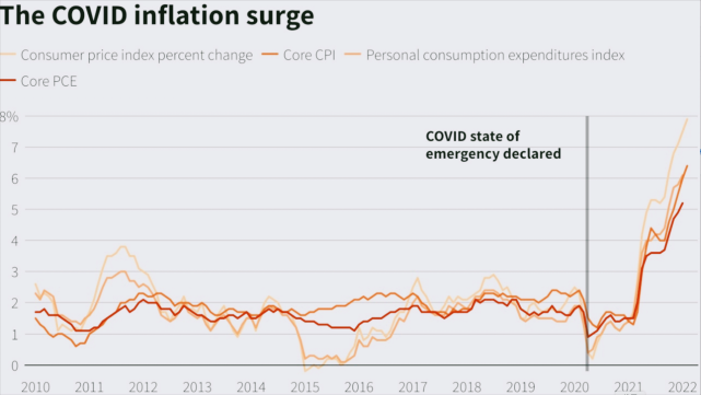 纽约联储在3月22日的调查显示,美国通胀预期中值在3月份升至6.2%,追平去年11月创下的历史纪录,美国劳工部在3月16日公布的生产者物价指数继续加速上涨,2月份生产者价格同比上涨10.0%,这是自彭博社调查该数据以来首次达到两位数,稍早前公布的2月CPI连续急升至7.9%,是1982年以来的最高涨幅。