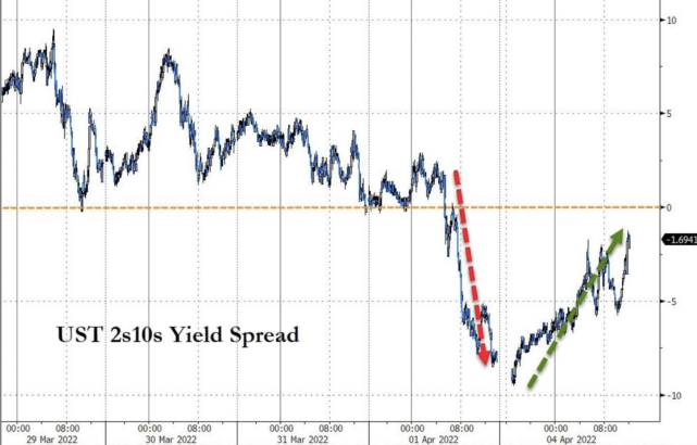 高盛在4月4日发表的报告援引的数据显示,一年前,两年期美债收益率低至0.15%,目前涨至2.7%,4月10日,远期市场显示,交易员正在为2年期和10年期收益率曲线出现倒挂将会持续更长时间在做准备,经验表明,美债收益率曲线倒挂通常是经济衰退的前奏,被金融市场形容为最惊人的趋势线之一。