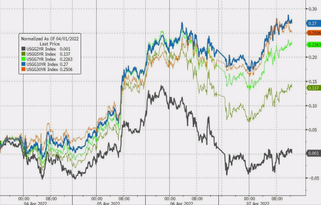 美国债券市场正在定价美联储鹰派政策。比如,会议纪要公布后,美国市场股债双杀,10年期国债收益率一度上行至2.63%(4月10日,目前该收益率已上涨至2.70%),创下二个月来持续时间最长的一轮涨势。30年期国债收益率一度上涨6.5个基点至2.43%,为2010年5月以来最高水平,更让市场担忧的是,10年期美债收益率涨幅大于2年期收益率,这些都是预示着美国经济将出现衰退。