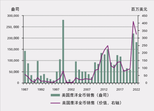 据总部位于伦敦的Metals Focus公布的数据,尽管美国3月消费信心指数出现大幅下降,但金币市场却意外保持强劲,预计2022年的总销售额会超过140吨,创下10多年以来的新高。据美国铸币局在4月5日公布的数据显示,2022年1至3月,美国鹰金币的销售量为76.21万盎司,这也是延续了2021年120万盎司销量后的又一次强劲表现,同时,2021年以美国市场为代表的银币销量也创下历史新高,银币销量为1.477亿盎司。但事情到此并没有结束,更让人意外的事情发生了。