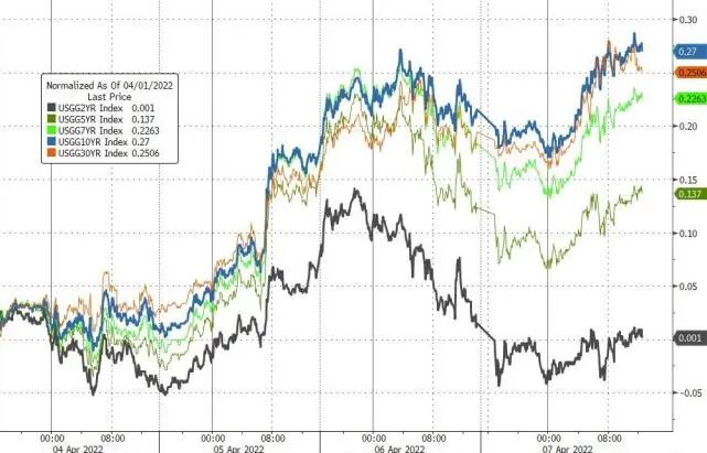 美联储更快更早地收紧货币政策和大宗商品市场短缺也让美国国债继续扩大跌幅,美债被投资者进一步抛售,美债收益率升至多年高位(具体数据趋势参考下图),债券收益率与价格成反比,收益率上升代表净抛售量大于购买量。