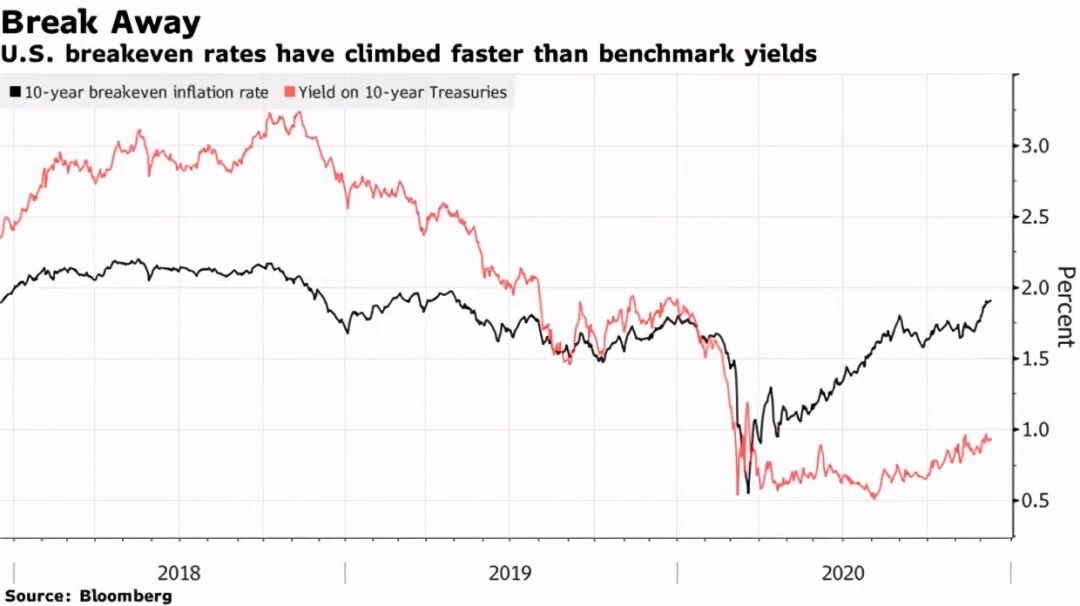 路透社在上周对90位分析师的最新调查结果显示,美国主权债券实质收益率远低于零,并暗示未来一年实质报酬也将呈现负值,美联储利率点阵图已经显示至少到2023年利率将在零水平,并允许通胀高于2%,据美国金融网站ZeroHedge援引的最新预测数据显示,如果实际房价包括在CPI衡量中,那么美国通货膨胀在1月将是3%。