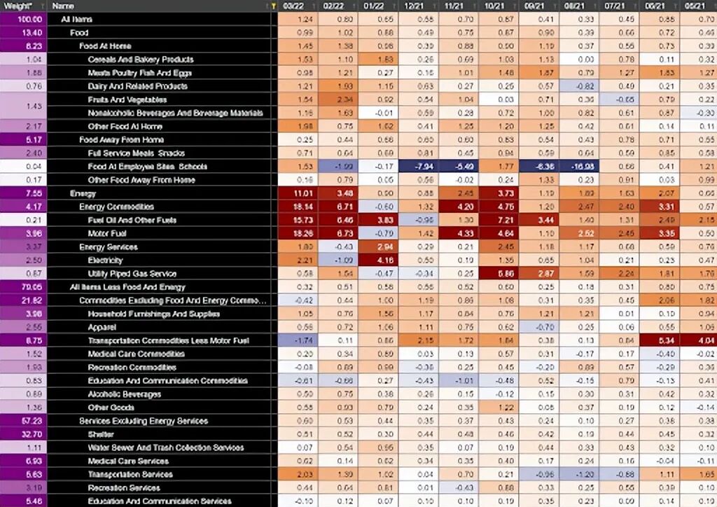 因为,商品通胀实际上环比出现下降(比如,二手车和卡车指数下跌了3.8%),换句话说,实际上,3月CPI总涨幅的50%以上主要受到天然气价格指数的影响(俄乌冲突将石油和天然气的价格推高至创纪录高位的结果)。