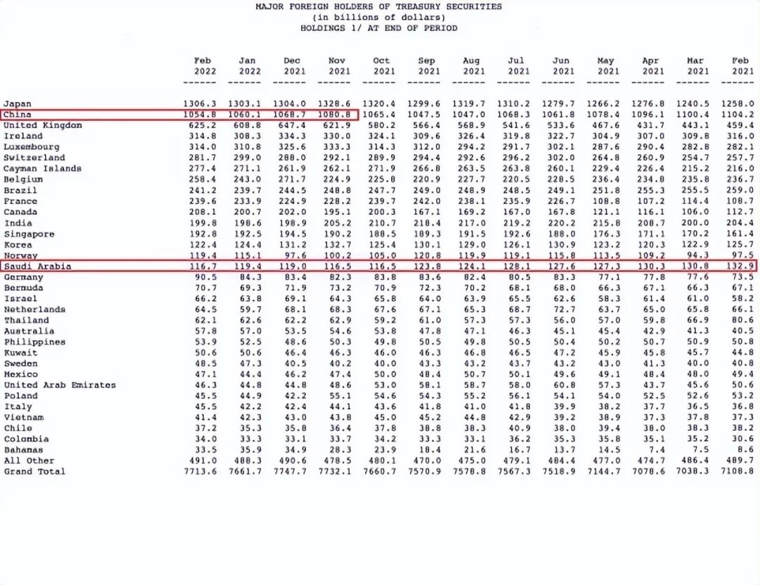 这就不难理解,石油国沙特持续减持美债的多重原因了。值得一提的是,TIC最新报告显示,2月,中国继续大幅减持53亿美元至1.05万亿美元,所持美债仓位创下五个月新低,且为连续三个月减持,报告显示,中国1月份在去年12月大幅减持122亿美债的基础上,再次大幅减持86亿美债,2021年11月和10月分别增持了154亿和178亿美元的美债。