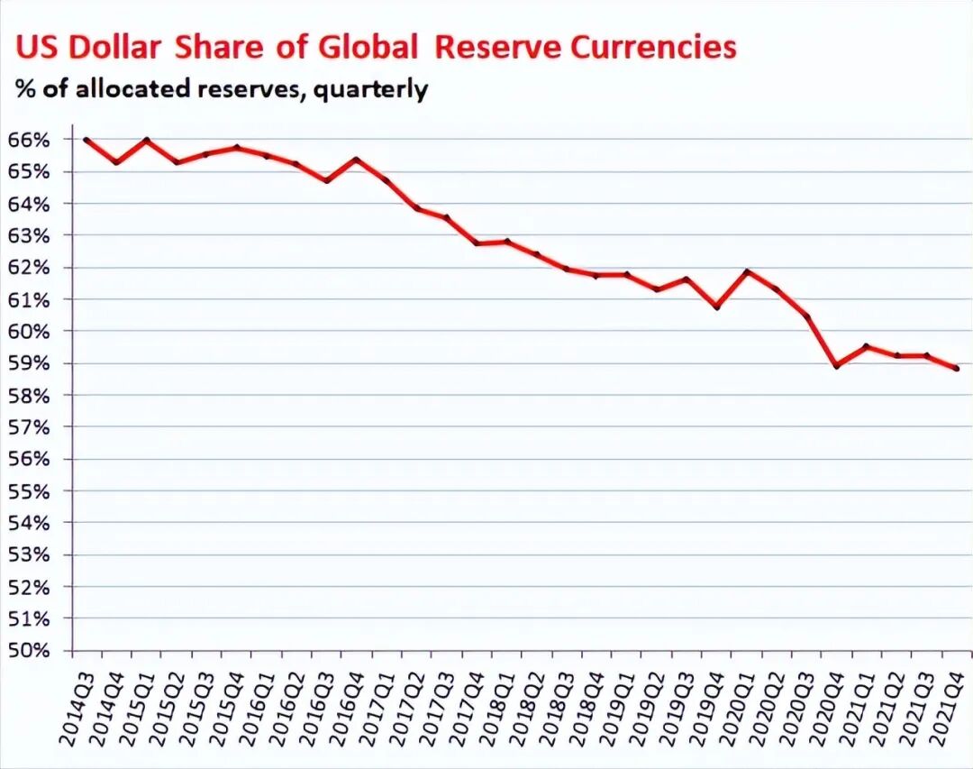 另据IMF在一周前最新公布的全球央行官方外储货币构成(COFER)报告显示,2021年第四季度,美元在国际储备中的份额从去年第三季度的59.15%进一步降至58.81%,创下26年以来新低,且为连续第三个季度下降。要知道,1977年,美元的份额高达85%,而通过下图,可以清晰地看到,美元的份额一路走低。