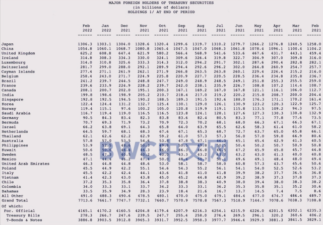 根据美国财政部4月16日最新公布的报告显示(美债官方数据会有两个月的延迟惯例),2月份包括全球央行在内的海外大型美债投资者抛售了162亿美债,其中,2月,中国大幅减持了53亿美债,所持仓位降至五个月以来的新低,我们注意到,这是中国连续第三个月减持美债,总额高达261美元,报告显示,中国1月、去年12月分别大幅减持122亿和86亿美元的美债,目前中国仍为美债的第二大海外债权人(具体数据细节请参考下图)。