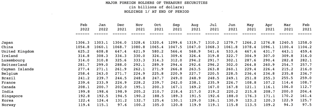 据美国财政部在4月16日发布的2月份国际资本流动报告显示,美债官方数据会有两个月的延迟惯例,中国在2月继续减持美债,出售了53亿美债至1.05万亿美元,所持美债仓位创下五个月新低,且为连续三个月减持,此前两个月分别减持了122亿和86亿的美债(具体细节请参考下图)。目前中国仍为美债的第二大海外债权人。值得一提的是,随着俄乌冲突以来,十年期美债收益率从2月底的1.98%升至目前的2.9%,我们料将会看到接下去的两个月的报告中全球央行会有更多的抛售。