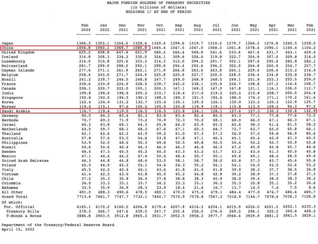 据美财政部在4月公布的最新报告TIC(美债持仓报告会有两个月的延迟),2月,全球央行净抛售了高达160亿美元的美国国债。例如,石油国沙特在今年2月减持了27亿美元的美国国债,目前持有1167亿美元。而自去年2月以来,沙特已经开始从此前的1329亿美元,累计共减持了162亿美元,总减比超过12%。能源货币专家告诉BWC中文网,沙特作为石油美元的主要发起者之一,连续大规模抛售美债,是美元地位面临下降的信号之一,对美元未来能否保持大宗商品交易货币之王的位置构成冲击的可能。