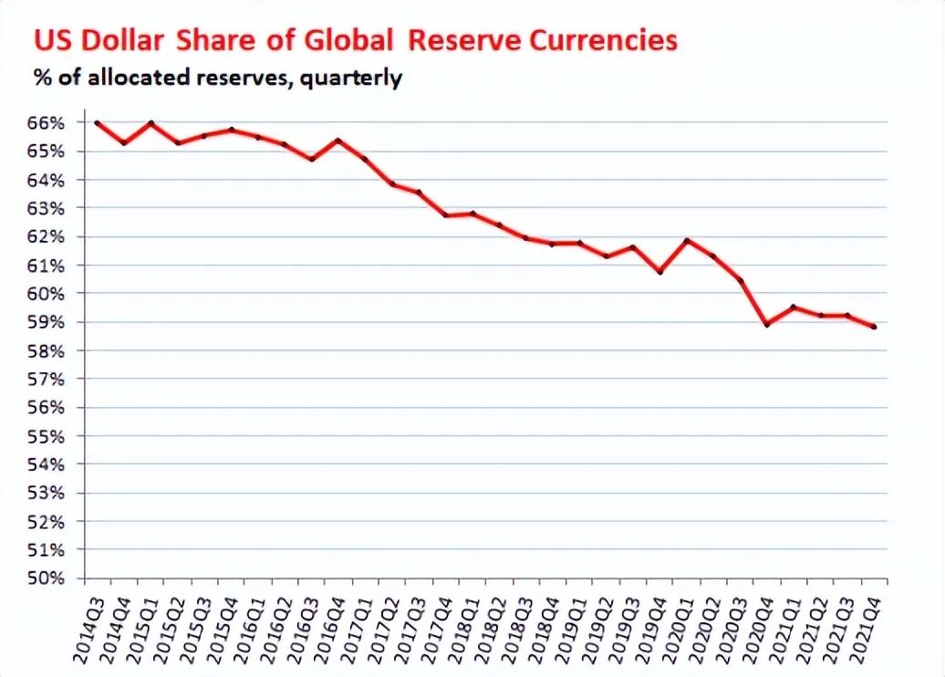 与此同时,美国金融网站Silverdoctor分析认为,在高通胀和美联储减缩背景下,外国人对美国国债的需求持续下降。这也将伴随美元不断失去购买力而愈演愈烈。IMF数据显示,美元在全球外汇储备中的比例在过去20年中从 73%下降到58%。