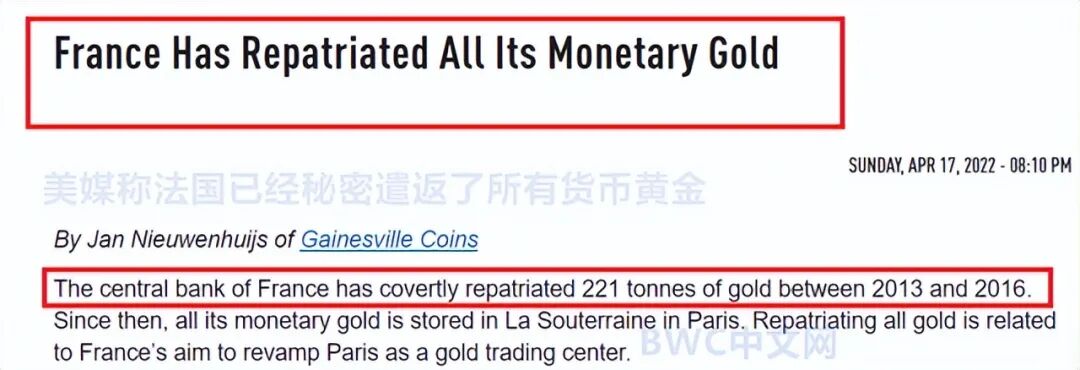 而事情的另一个最新进展是,美国金融网站Zerohedge4月17日最新消息显示,法国已运回全部货币黄金。该美媒称,法国央行在2013年至2016年期间秘密遣返了221吨黄金。从那时起,其所有货币黄金都存放在巴黎的拉索特兰。
