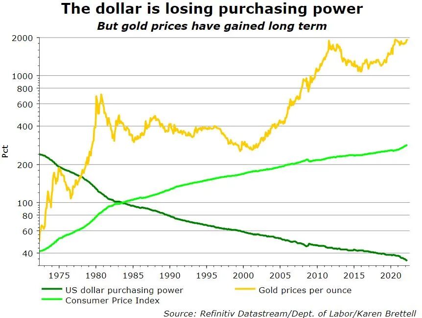 要知道,瑞士黄金交易所的数据具有某种风向意义。而这个意义的重点,正是美元不断失去“美金”的价值。“我们在不到一个人的一生中使用的美元已经失去了大部分购买力,这就是推动一切的原因,”科森斯说。而通过下图,可以更加清晰地看到,美元和黄金购买力的趋势对比。