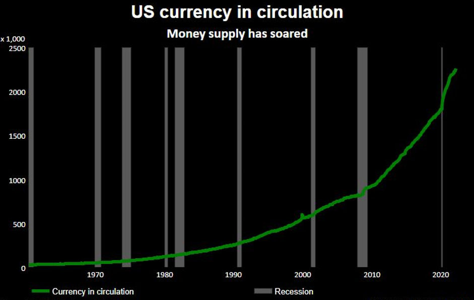 据美联储数据显示,目前流通中的美元为2.25万亿美元,高于2020年初的1.80万亿美元和2007年的8000多亿美元。